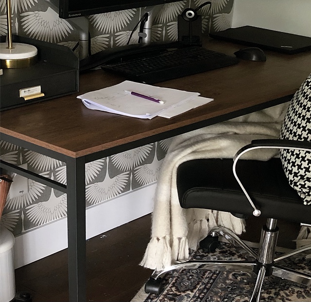 Mr. Housebehindthetrees is a tall, long legged fellow. I ordered a desk way back when, when I was buying furniture for the house prior to us moving in and I painted the office Naval Night which is a navy almost black color. Everything was looking great …. until Mr. could barely fit under the desk!