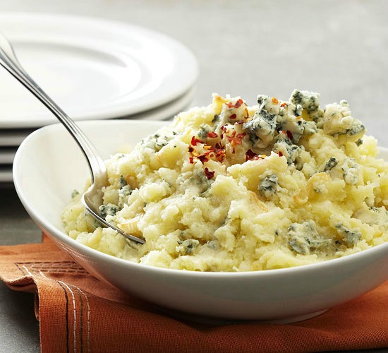 Blue Cheese-Garlic Potatoes ~ What could be better than mashed potatoes, you ask? How about our tangy, spicy twist on the classic Thanksgiving recipe, which features creamy blue cheese and smoky red pepper flakes. Crushed garlic adds a savory spin to this new holiday favorite.