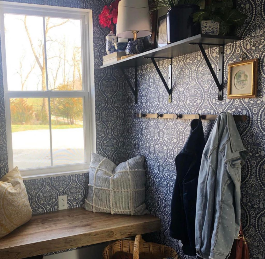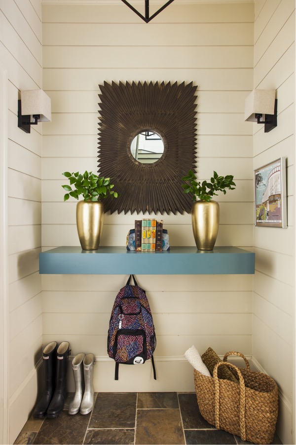 Not everyone has an actual built in room as a mudroom with the infamous locker storage. I actually choose to NOT do built in lockers in our mudroom, instead I opted for a built in floating bench which I have added baskets too. I get asked quite a bit why we didn’t do a more traditional locker system here but 1) I am definitely not a trendy or traditional in the mere sense of the word, kinda gal. I am unique and like the unexpected. and 2) I don’t have littles anymore that need a backpack, coats, hats, mittens, etc drop zone. Those heavier winter items actually get dropped in the garage before entering this space. So this space is for lighter items used daily.