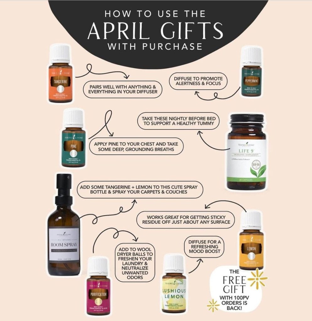 LET’S BREAK THESE GIFTS DOWN… With spring in full bloom, we’re focusing on cultivating a clean and essential lifestyle with April’s gifts! See more details right HERE. 100PV ($15.79 retail value)