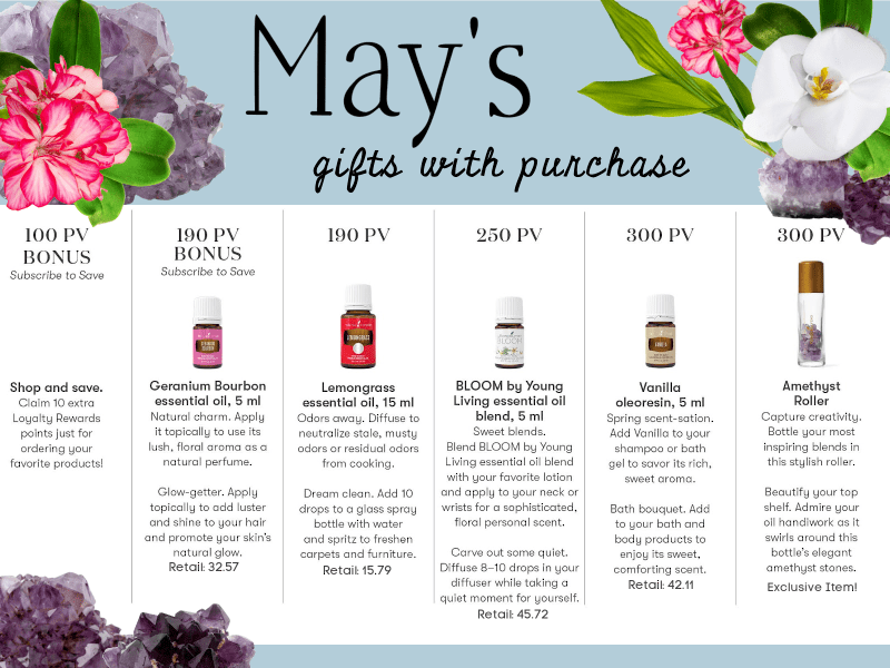 Let’s look at YL May Gifts With Purchase ~ ahhh the fresh scent of Lemongrass and BLOOM essential oil blend. Give your hair natural shine and your skin a natural glow with Geranium Bourbon. Don’t forget about that gorgeous scent of Vanilla, it’s perfect with a few dabs on your neck or wrist or just to smell straight out of the bottle! This month you can also receive an amethyst roller which is perfect to carry your favorite scent and you’ll earn 10 extra Loyalty Rewards points for simply ordering the products you love!