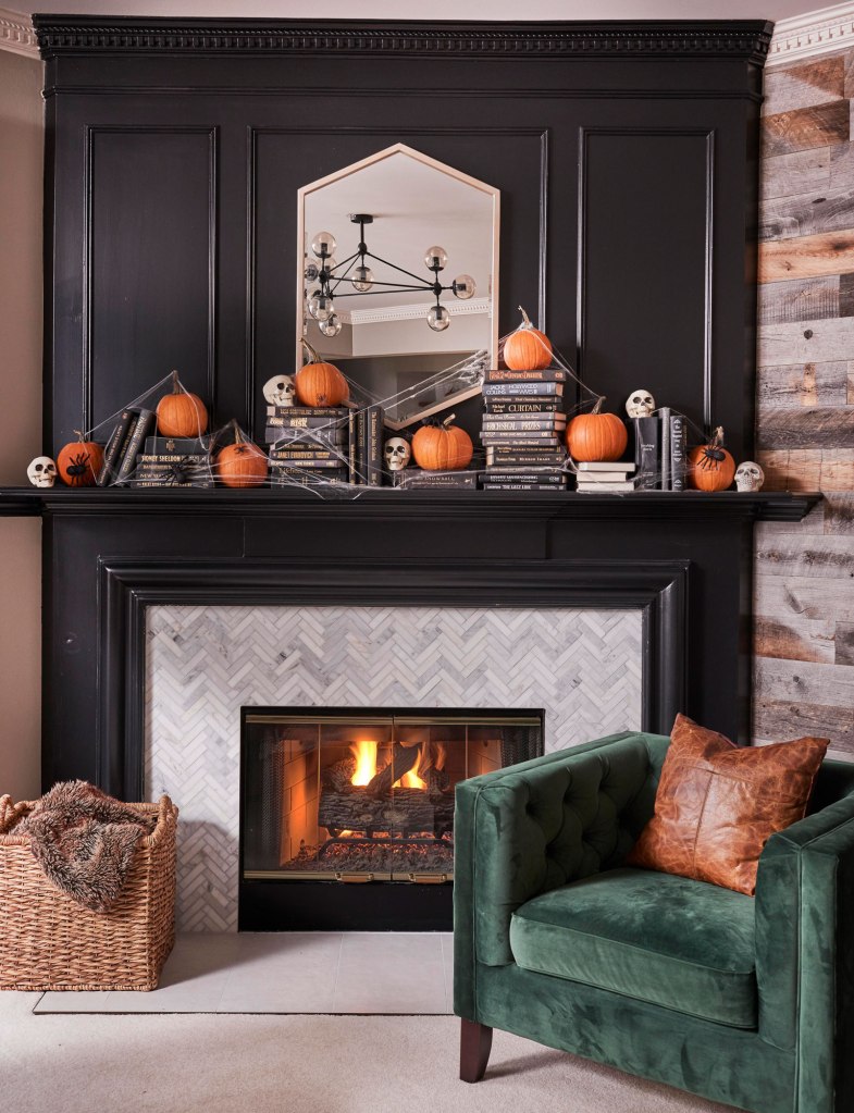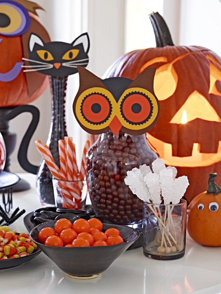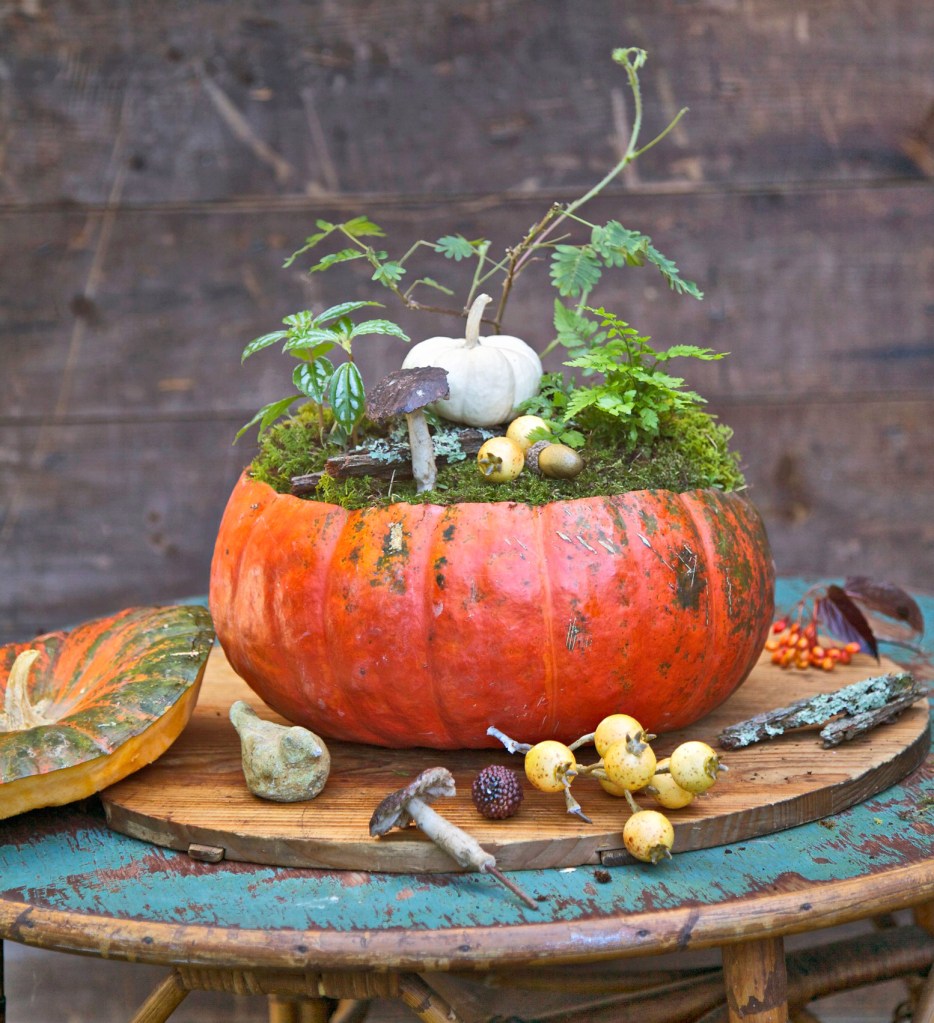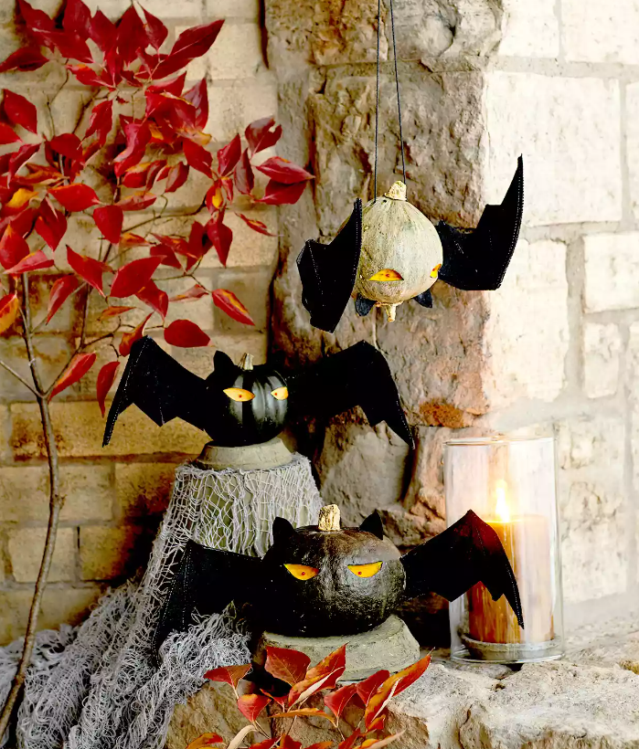 For the pumpkins, cut 12×12 cardstock into strips 1 inch wide and 9 to 12 inches long, depending on the size of the pumpkin. Punch a hole in the top and bottom of strip 1/4 inch from the edge. Place a brad fastener through the top holes and another fastener through the bottom holes. Bend strips so they form a backward C. Knot a piece of string around a brad, pull taut and tie around the other brad. Separate strips into a sphere. You can make tendrils and stems with floral wire, crepe paper and glue.
