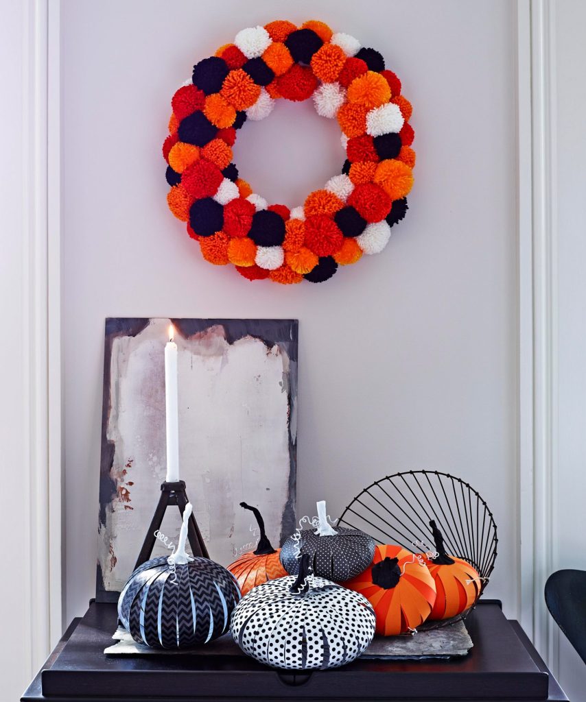 For the wreath, make or buy yarn pom-poms in a variety of colors and shapes and attach to a foam wreath with U-shape floral greening pins.
