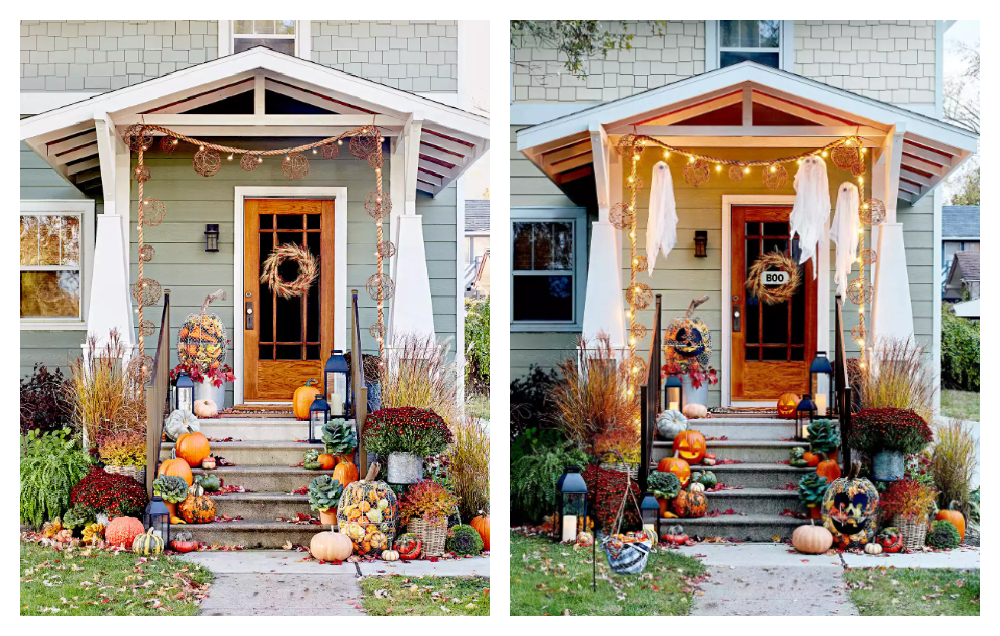 While decorating your door for Halloween can be fun, there’s something to be said for transforming your entire porch for the holiday—especially if you’re hosting a party or expecting a lot of trick-or-treaters. Start with a wreath to center your design, then add pumpkins, gourds, and seasonal plants to the front steps. Frame your porch with string lights and a few hanging ghosts for a spooky yet inviting display. From Google Search