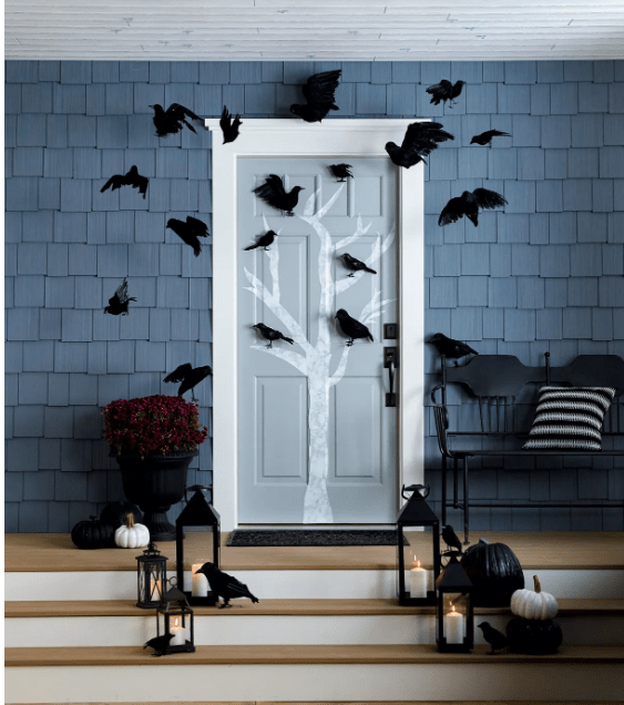 Welcome trick-or-treaters by turning your front porch into a spooky scene. Start by using chalk to draw a tree on your door (or create one with paper or felt for easy post-holiday cleanup) to center your design around. Then, attach a flock of paper crows or bats to your door and porch walls with paint-safe adhesive. You can even hang them from the ceiling with fishing line to give the illusion of birds taking flight overhead. For the stairs, add a few standing crows, black metal lanterns, and black-and-white pumpkins. From Google Search