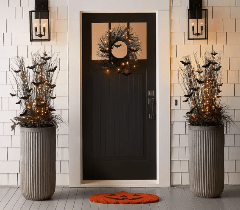 Black Bats, twinkle lights and a jack-o-lantern door mat, make for a fun quick porch transformation before the trick or treaters arrive!