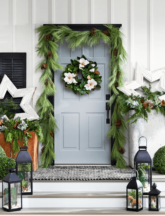 This simple yet timeless idea is sure to give your porch some winter cheer. Place seasonal decor like lanters with with faux snow, stars, magnolias and evergreen branches.