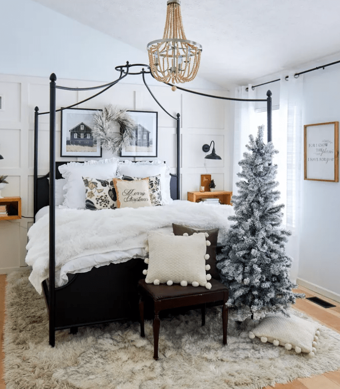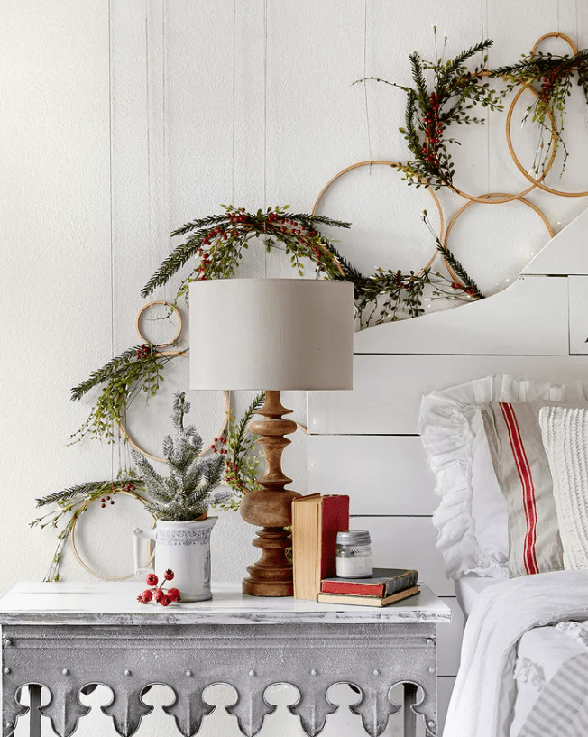 Gather a range of hoop wreaths and decorate them with small sprigs of winter greens and red berries. Then, hang them with an invisible thread to frame the headboard or anywhere you want to add a bit of charm.