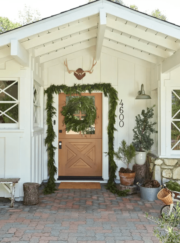 Hang a pair of antlers above your front door for a rustic yet elegant look. This small touch goes a long way when you add garland and a wreath. Finish the look with planters featuring miniature evergreen trees and pinecones.