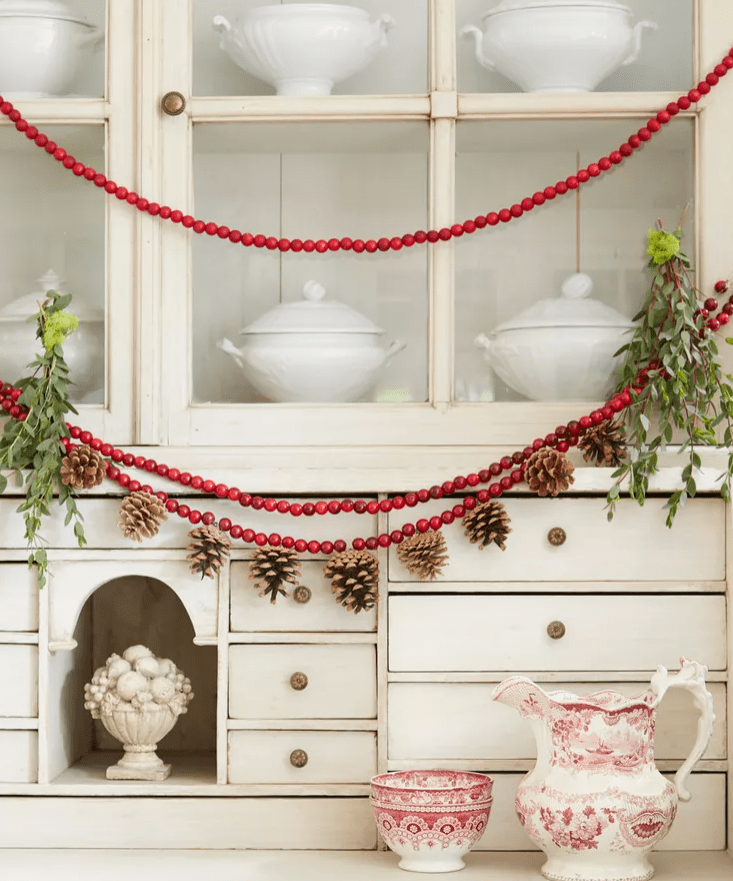 Cranberry garland might be a Christmas staple, but can be a great winter decor option to keep up even after the holidays are over, Valentines Day anyone. Stringing real cranberries in front of your fireplace mantel looks effortless and makes a statement. Use floral wire to tie pinecones throughout the garland. Finish off the ends of this garland with some eucalyptus bunches to anchor your garland to your fireplace.